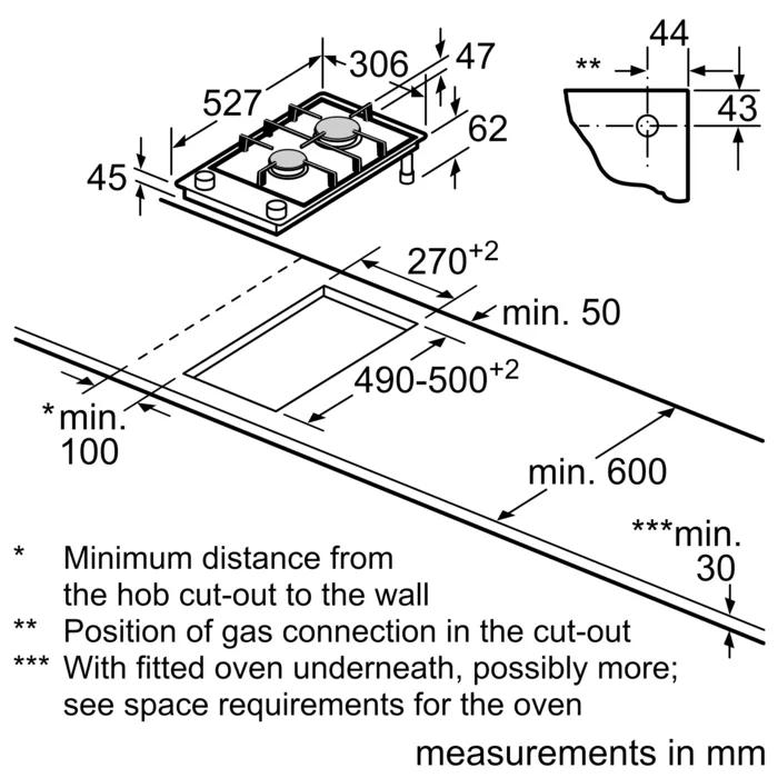 این مدل صفحه گازی دارای ارتفاع 306، عرض 527 و عمق 47 میلی متر و وزنی در حدود 10.6 کیلوگرم است. ابعاد فضای مورد نظر که دستگاه داخل آن قرار می گیرد بهتر است به این شرح باشد: