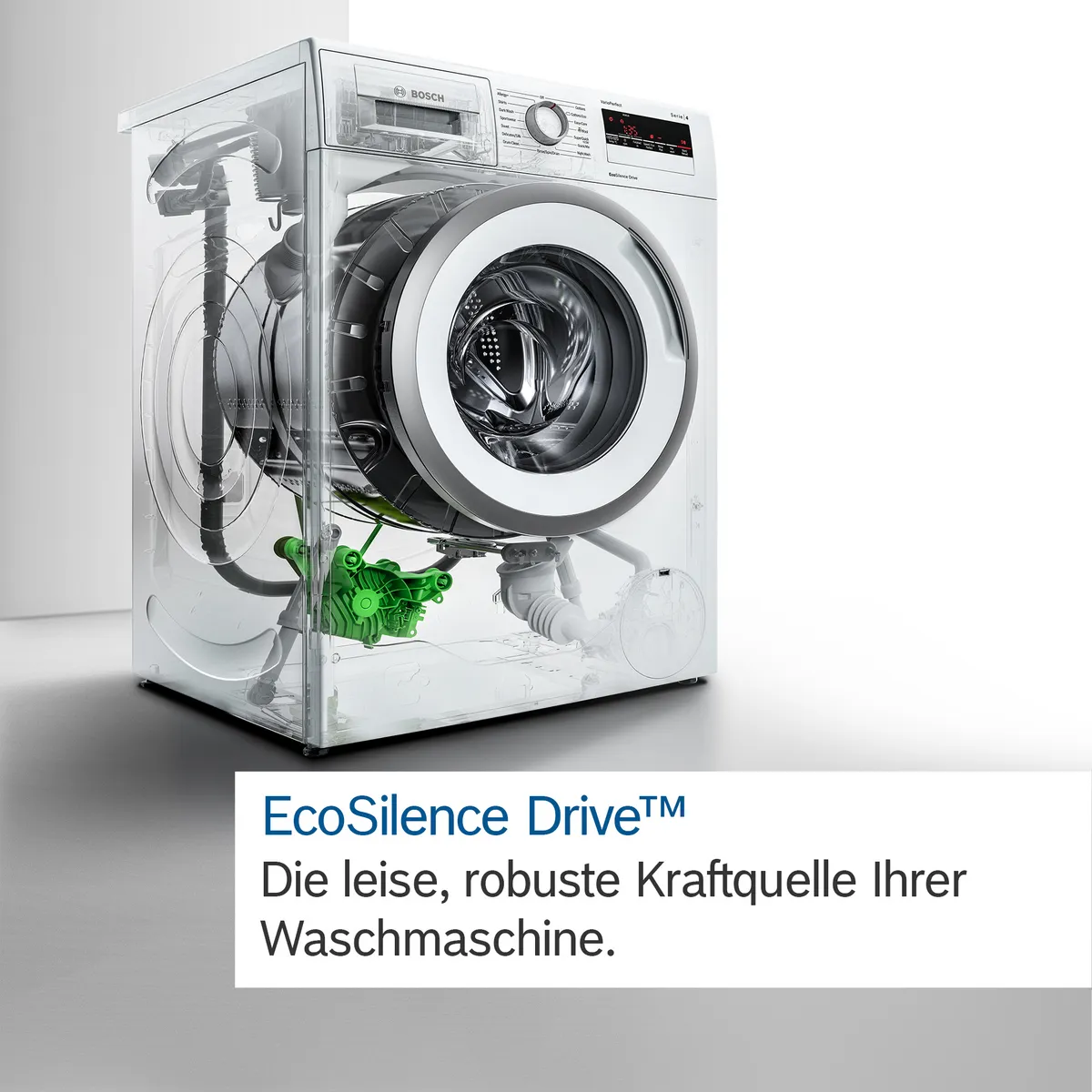 بوش در این ماشین لباسشویی از موتوری کاراآمد استفاده کرده است که رده انرژی آن +++A می باشد که هر چند گیربکسی نیست و از تسمه استفاده می کند اما بسیار کم مصرف می باشد. در این ماشین لباسشویی صدا برابر با 50 تا 72 دسیبل می باشد که صدایی پایین در نظر گرفته می شود. بوش برای ایزوله کردن صدا از نمد هایی در دور درام و موتور استفاده کرده است. برای کاهش لرزش در این ماشین لباسشویی بوش از طراحی ضد لرزش یا Anti Vibration بهره برده و از طرفی دیگر با وزنه بتنی موتور را مهار کرده است تا هیچ گونه حرکت جانبی را نداشته باشد.